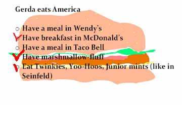 I tried Marshmallow-fluff and junior mints, two american brands of sweets (actually, according to US standards, fluff might pass as food). Marshmallow fluff is marshmallow in a paste-like consistency from a jar. I don't know what it's for, maybe something you can put on toast? I just had a spoonful straight from the jar. I was more fascinated by the concept of changing the consistency of marshmallows than impressed by the taste. The Junior Mints however, were delicious! They are soft mints covered in chocolate. You might remember them from the episode of Seinfeld in which Kramer drops a junior mint into someones abdomen during a surgery.